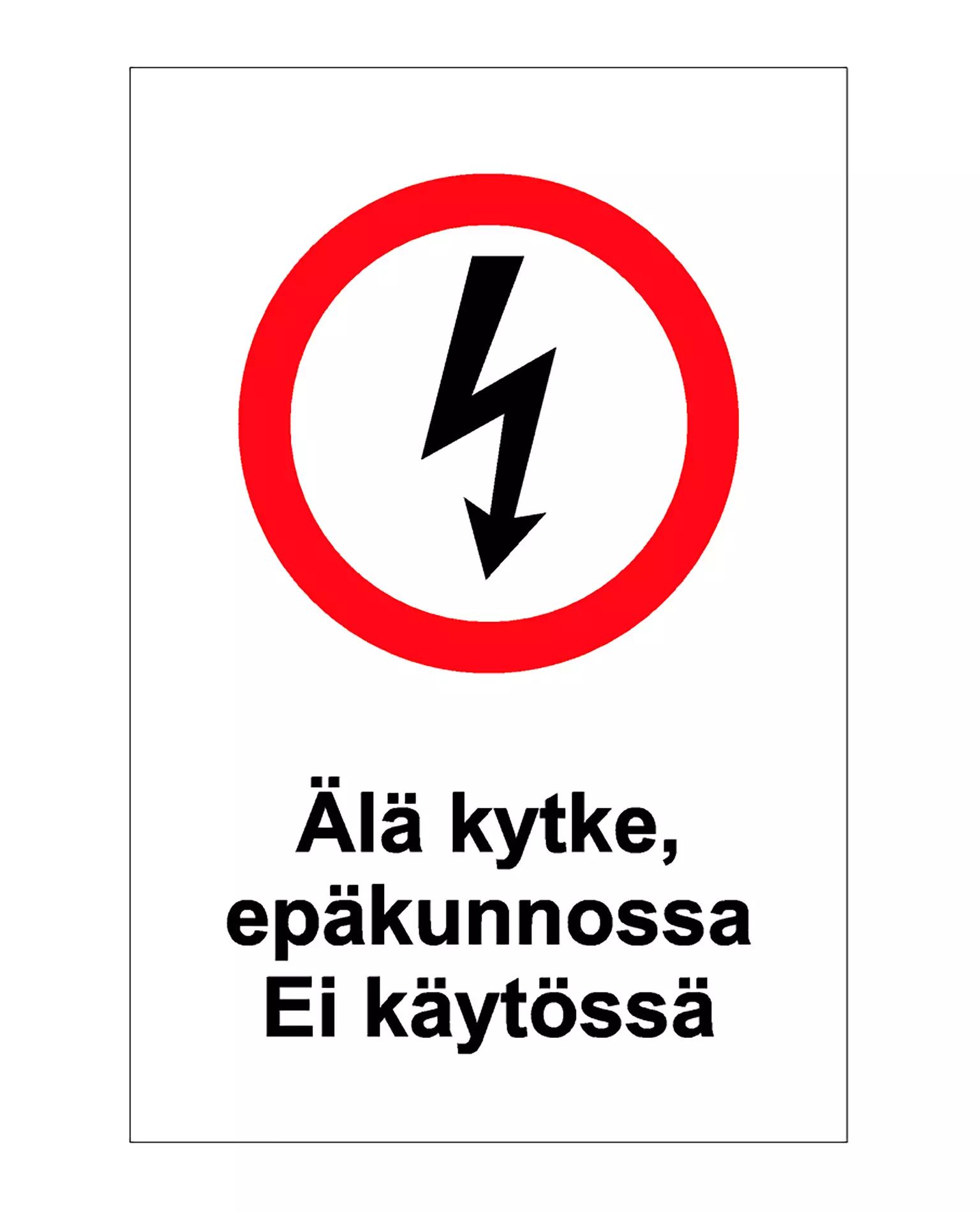 - Tuotepolku Etusivu Kyltit ja opasteetMuut kyltitSähköalankyltit Älä kytke epäkunnossa, Muovi 1mm, 300x400 mm
