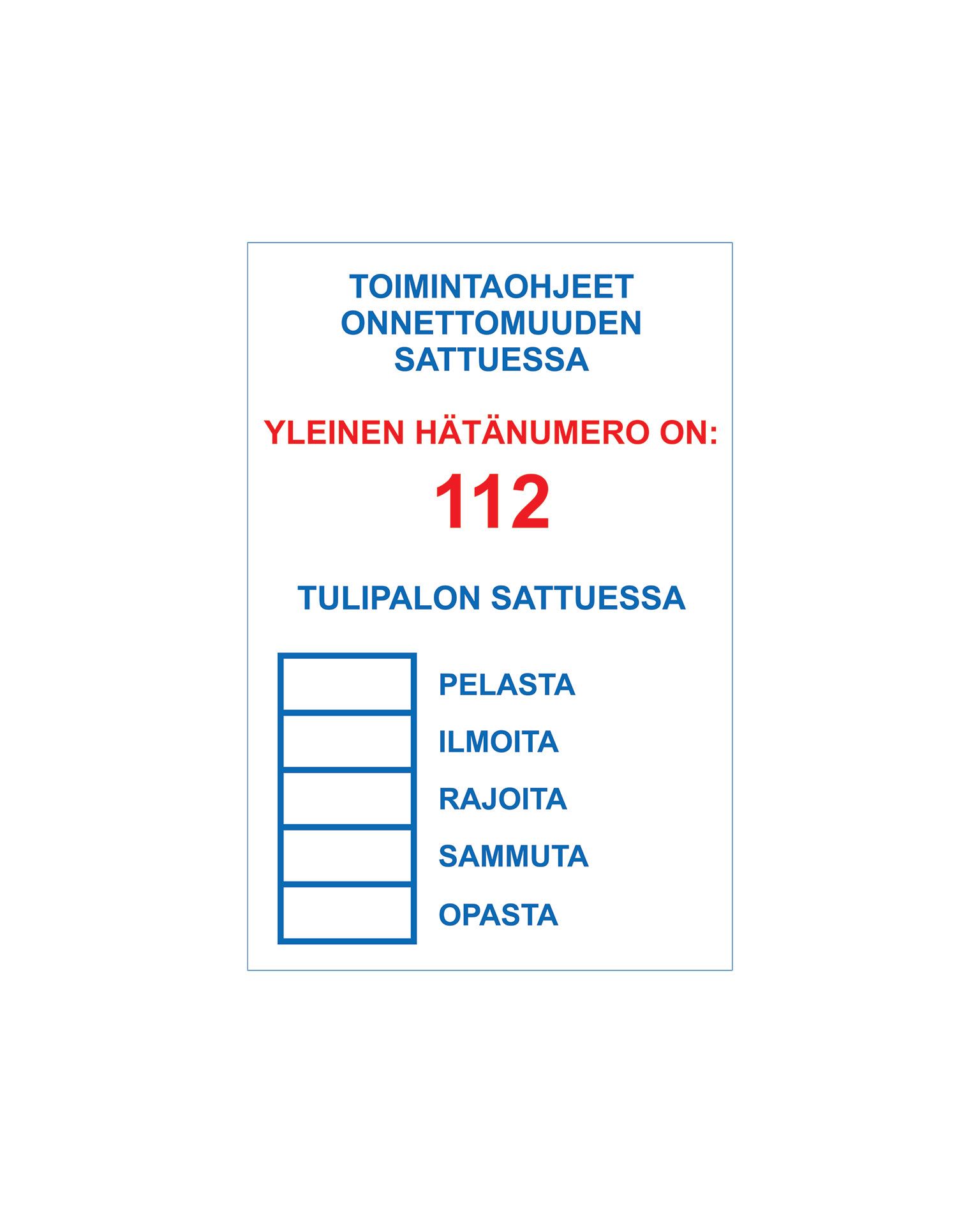- Tuotepolku Etusivu Kyltit ja opasteetOpastekyltitPaloalanopasteet Toimintaohjeet palon sattuessa, Tarra, 200x300 mm