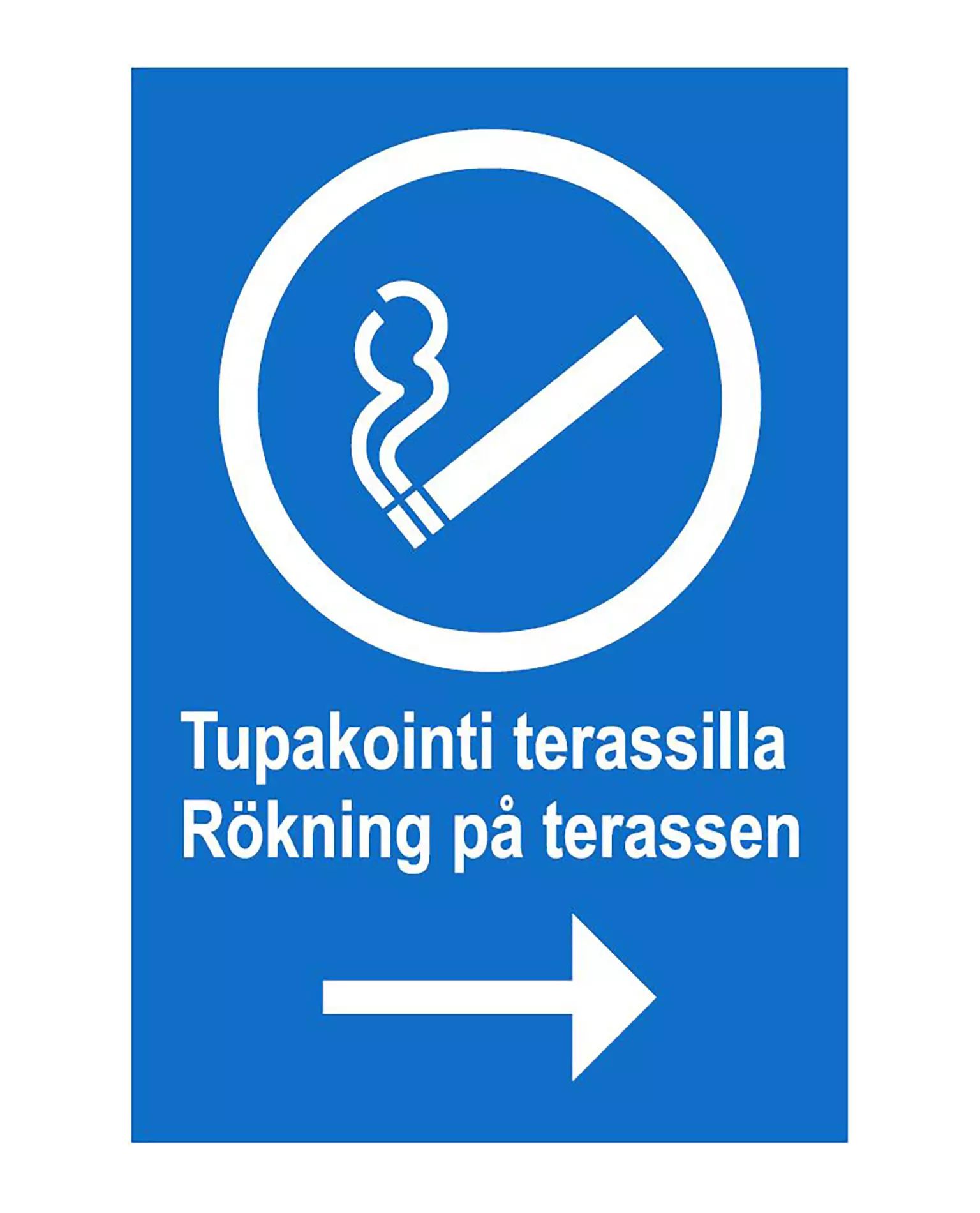 - Tuotepolku Etusivu Kyltit ja opasteetMuut kyltitKiinteistökyltit Tupakointi terassilla ruotsi, Ibond alumiini, 200x300 mm