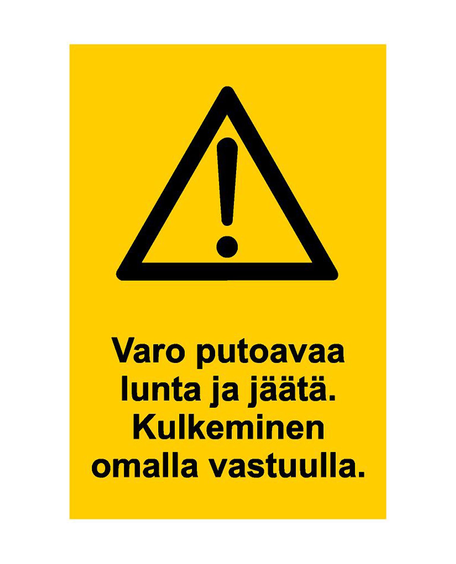 - Tuotepolku Etusivu Kyltit ja opasteetMuut kyltitVaroituskyltit Varo putoavaa lunta ja jäätä kulkeminen omalla vastuulla, Magneetti, 300x400 mm
